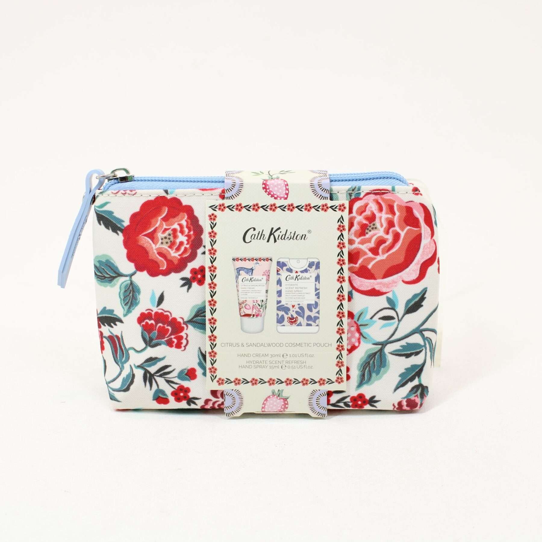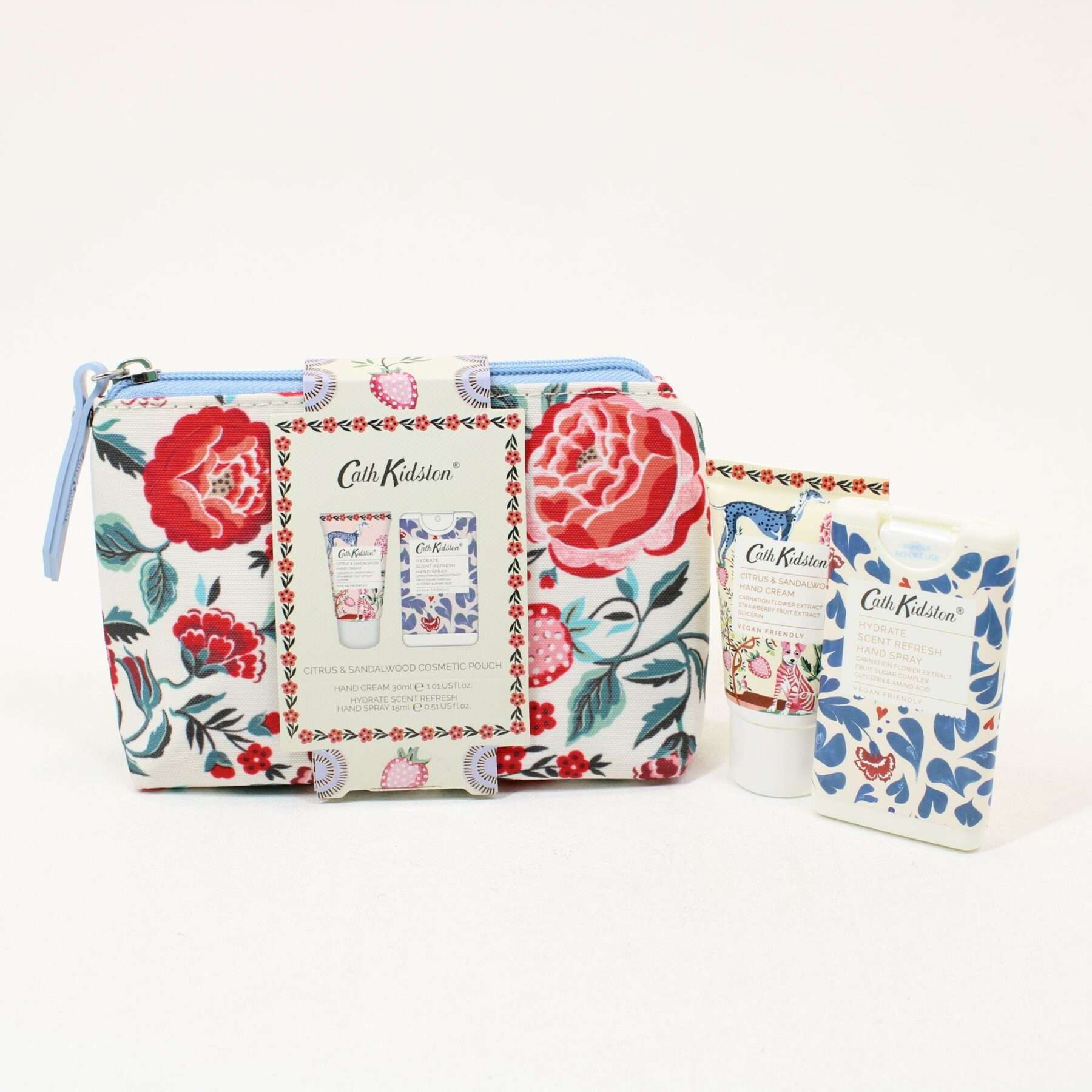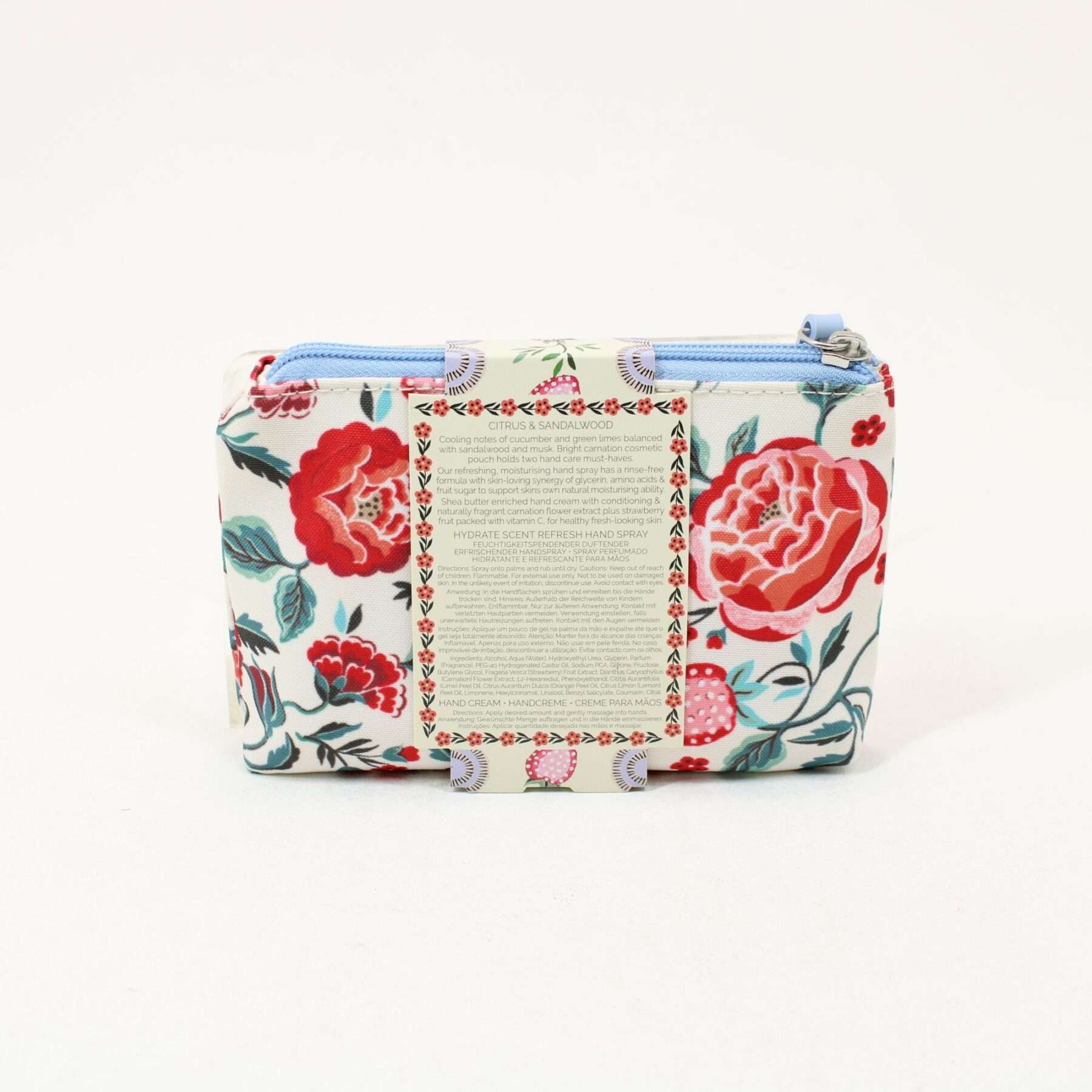 Citrus & Sandalwood pocket hand cream and rinse-free hand cleansing spray in a neat, zippered pouch bedecked with carnations and perfectly sized for a handbag. A jolly gift idea to care for hands on the go.