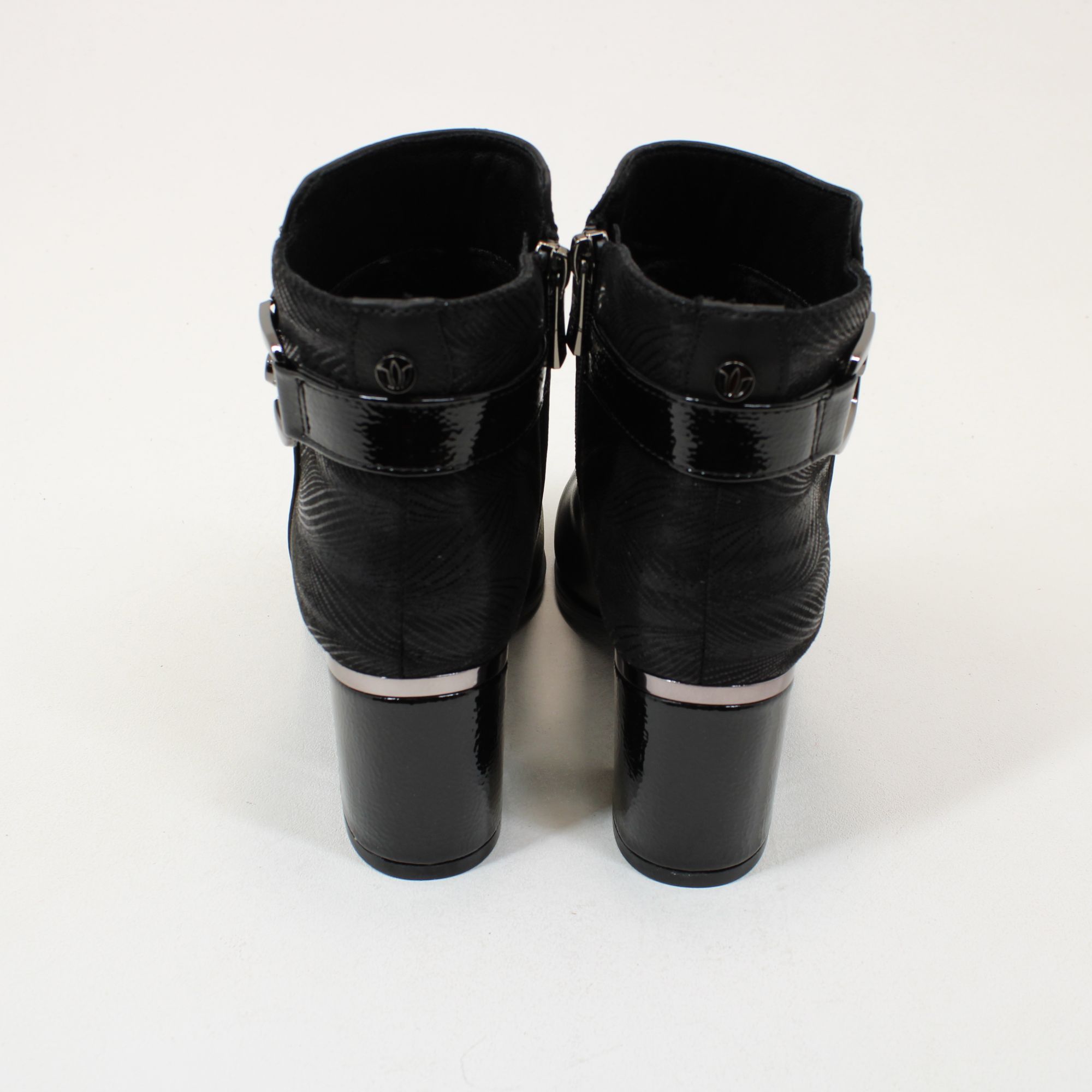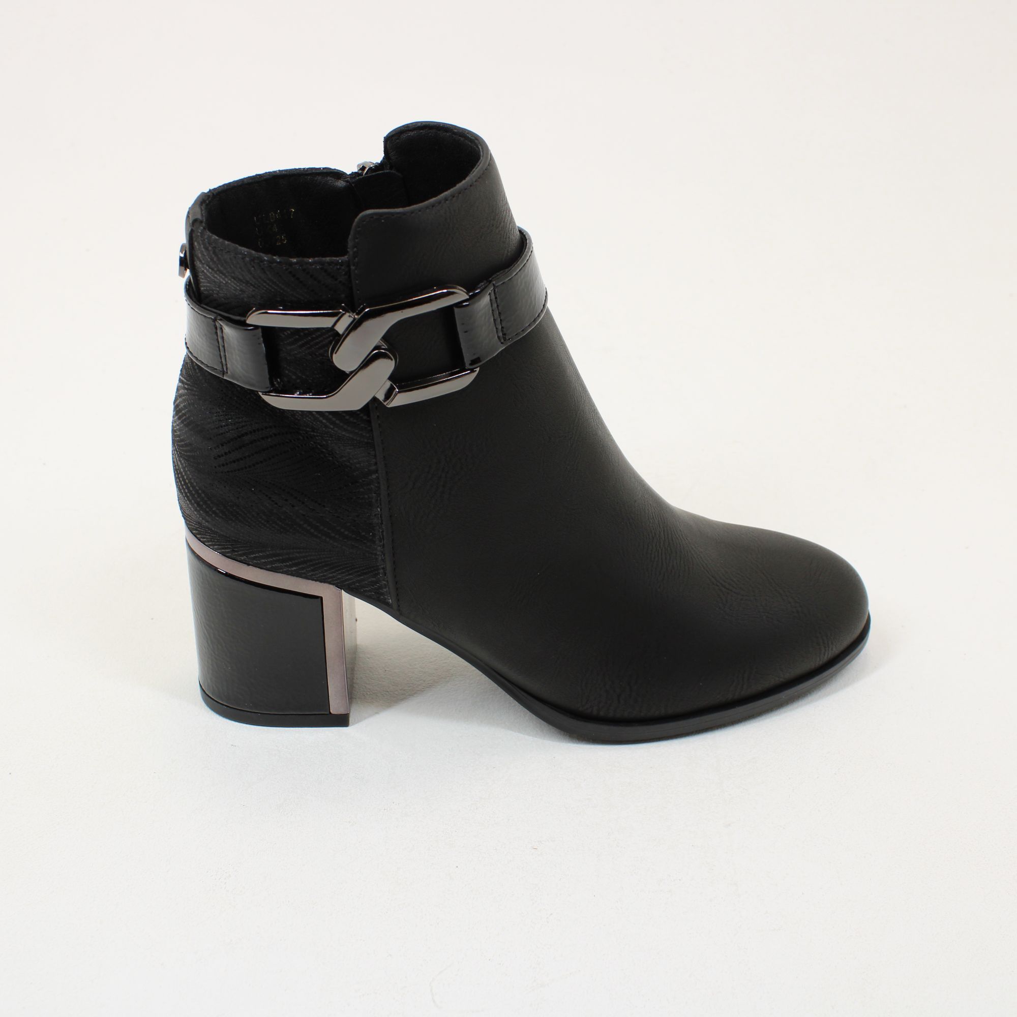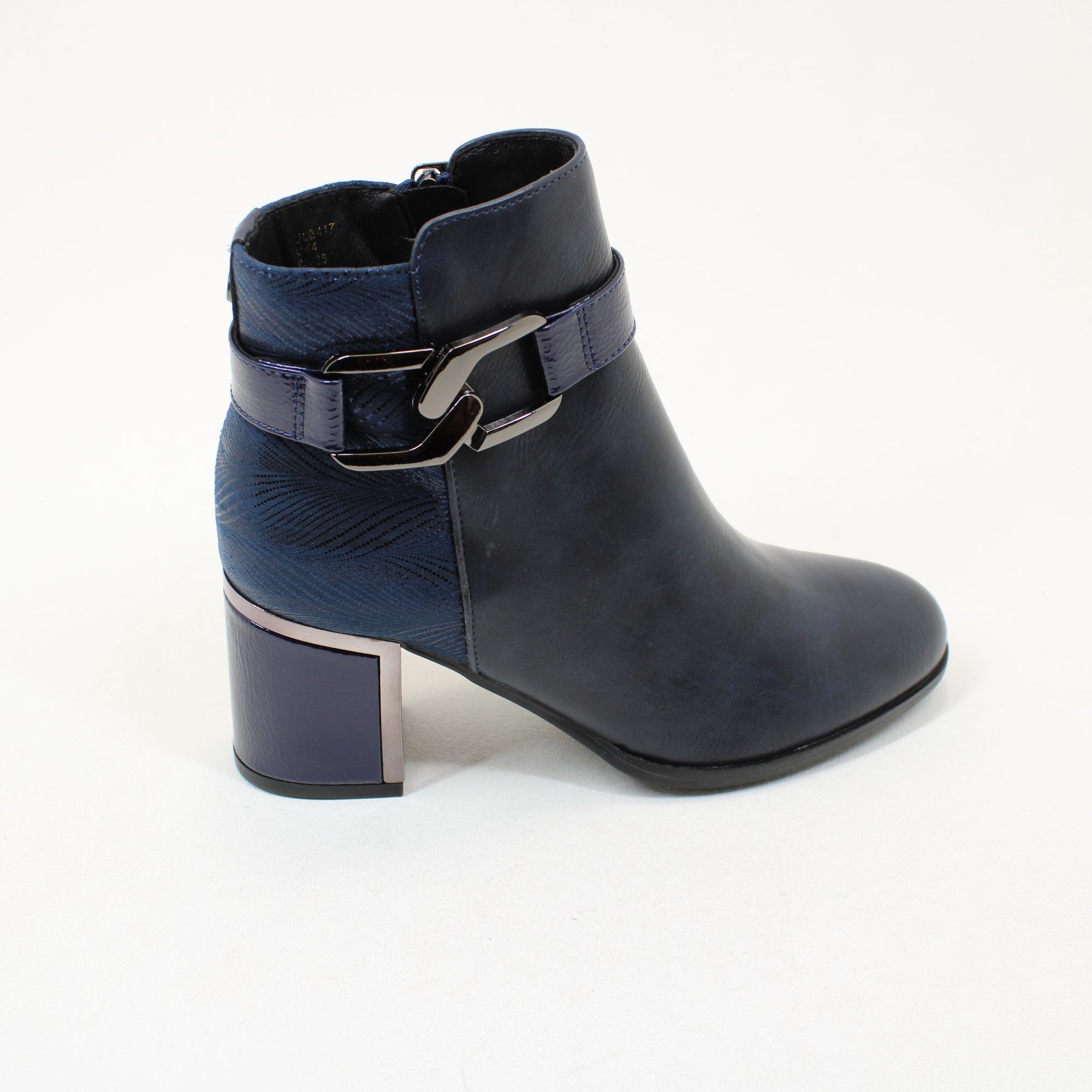 The Lotus Adelaide ankle boot oozes style and flair, making it a must-have addition to your new season wardrobe. Giving this women’s navy boot a distinctive finish is a patent wraparound strap complete with interlinking polished metal hardware on the side of the boot. Other distinguishing features of this imi-suede boot include a textile printed back panel and a 6.5cm block heel that is enhanced with a metal plate and trim. This soft almond pointed toe ankle boot is at the height of versatility and wearability.