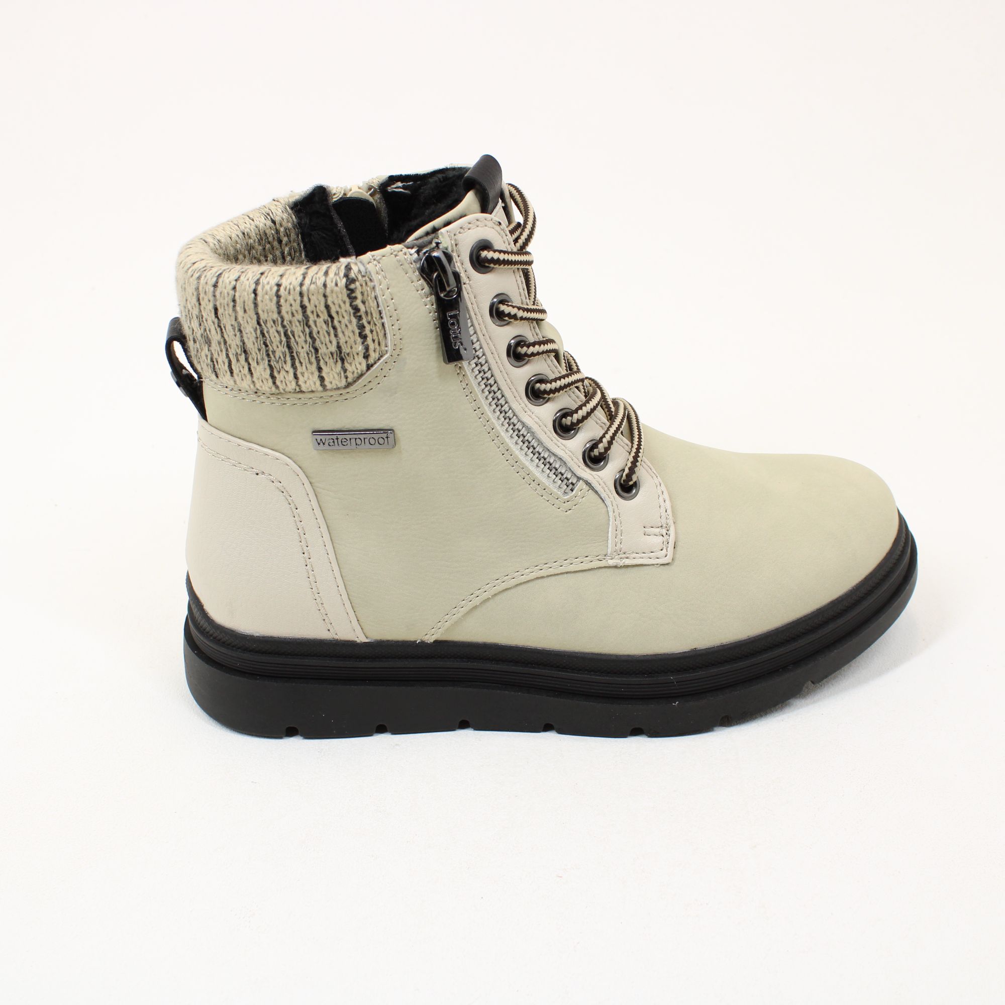 Packed with functional features and stylish touches, the Lotus Saundra ankle boot is a must-have addition to your wardrobe during the colder wetter months. This women’s almost flat, lace-up boot is part of the new Lotus range of waterproof boots so it boasts a water repellent upper, a fully waterproof membrane, a bellowed tongue that prevents water ingress from the sides, taped seams that stop water penetrating the stitching and a zip gusset that gives an additional moisture barrier. Taking styling references from a walking boot, this ladies’ black ankle boot encompasses hiker laces, metal eyelets, an external zip, a knitted ankle collar and a cleated sole that offers excellent support and traction.