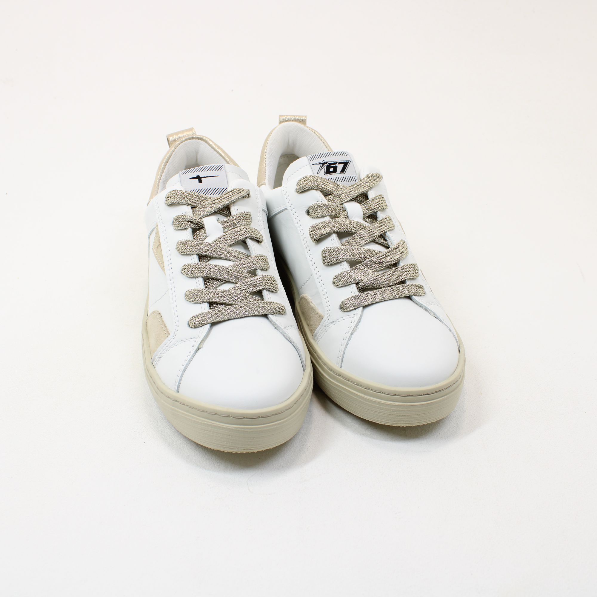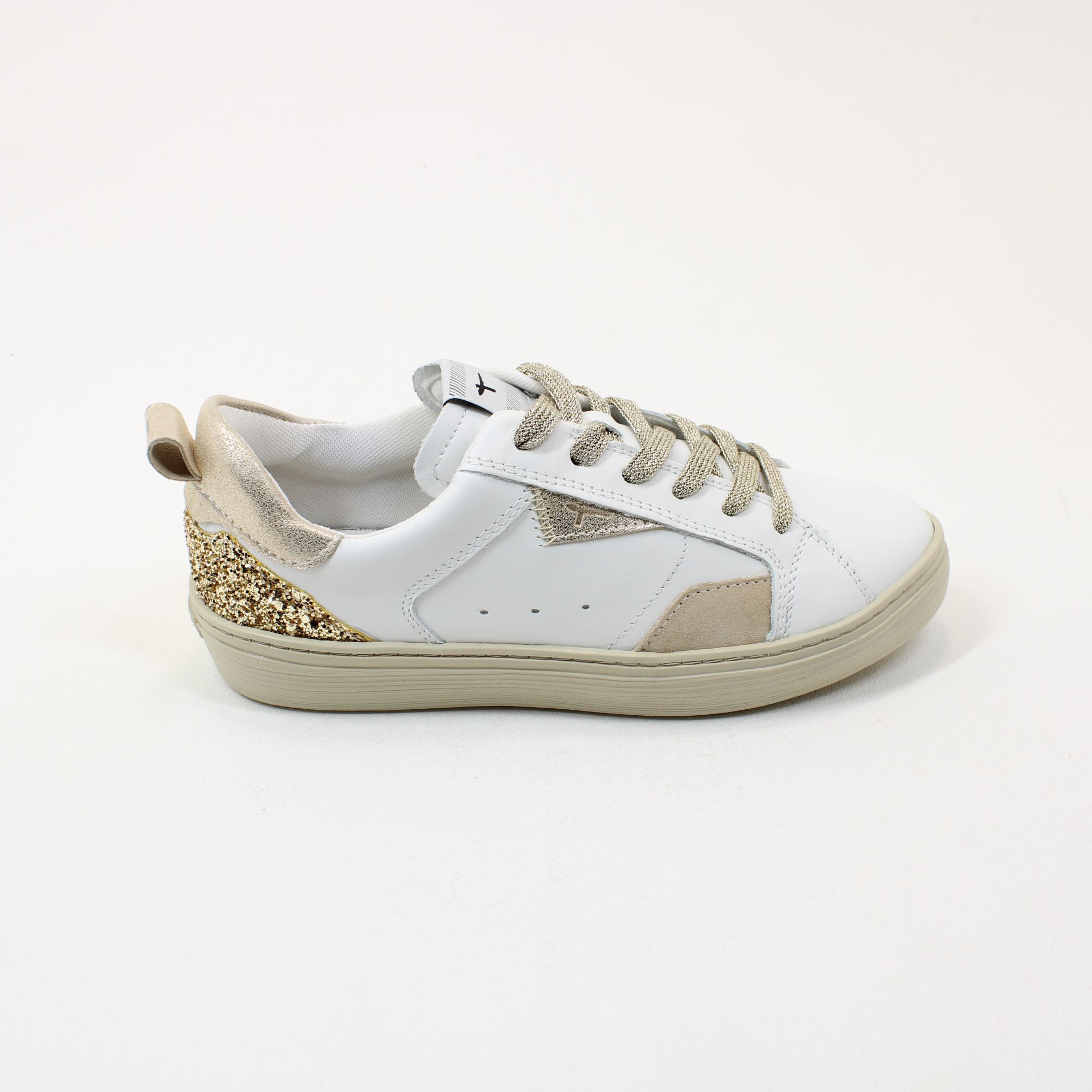 Elevate your footwear collection with our stunning white sneakers adorned with exquisite gold glitter detailing. These stylish sneakers seamlessly blend comfort and glamour, making them perfect for both casual outings and special occasions. The lightweight design ensures all-day wearability, while the eye-catching glitter accents add a touch of sophistication to any outfit. Step out in confidence and make a statement with these versatile sneakers that are sure to turn heads.